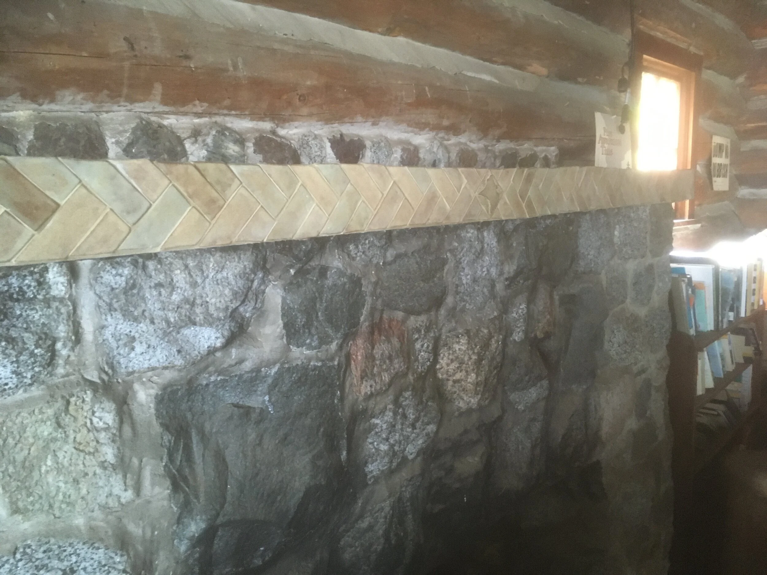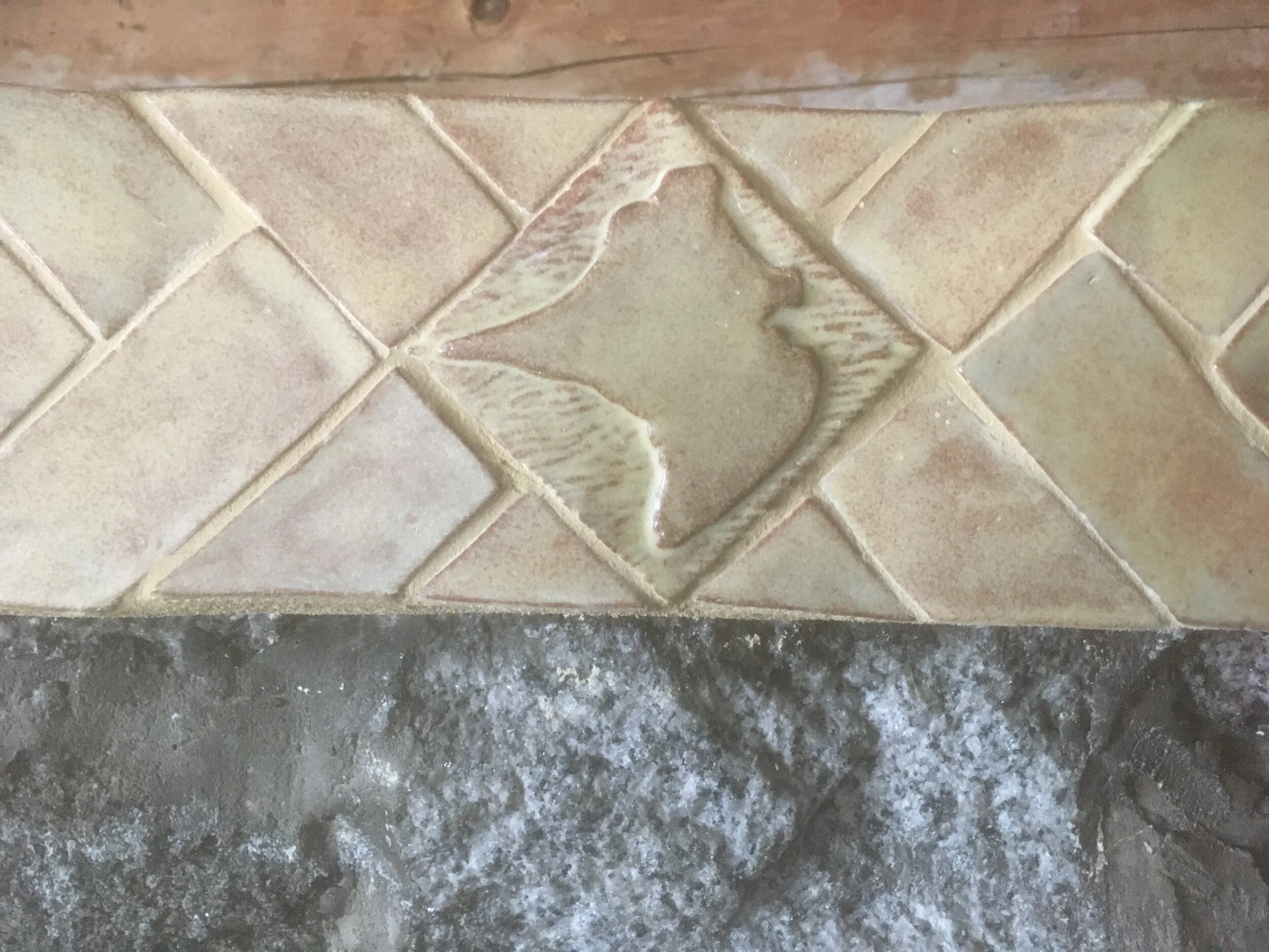 The post office on Waldron Island has been a lifeline and central community space since the 19th century. The classic log building has been well-loved over the years, and in the current era its functions are more important than ever. It’s a place to gather, connect, and exchange news. I wanted this installation to be a quiet one, harmonizing with the existing space and looking as if it had always been there. The wrap-around tiles on the corners show the versatility of handmade custom work, and the central carved tile is a relief image of Waldron Island.